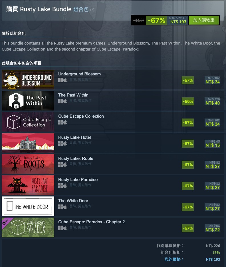組合包「Rusty Lake Bundle」再打 85 折,售價約 193 元。